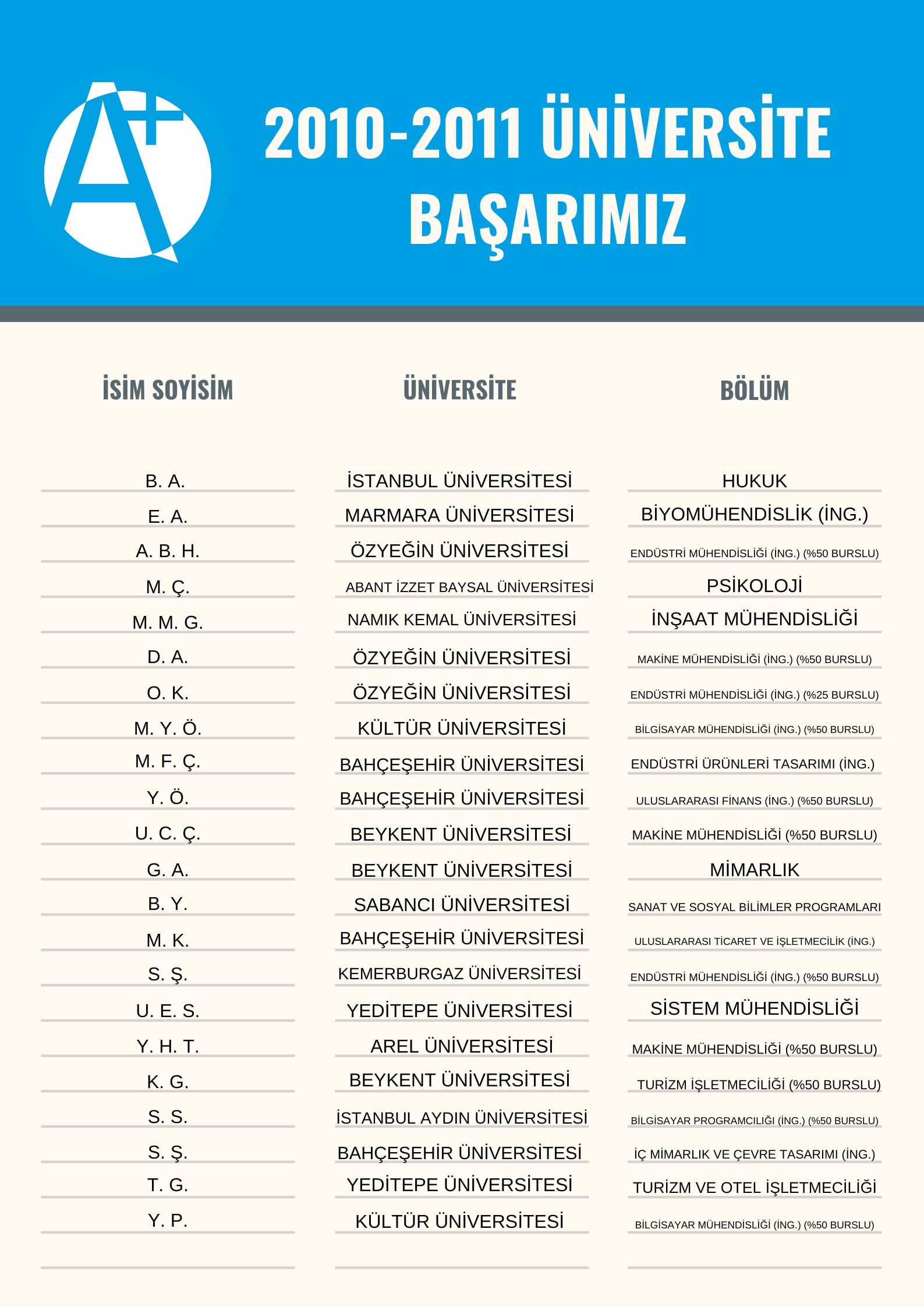 2010 – 2011 yılı üniversite başarımızı sizlerle paylaşmaktan gurur duyuyor, tüm mezunlarımıza hayatlarında başarılar diliyoruz.