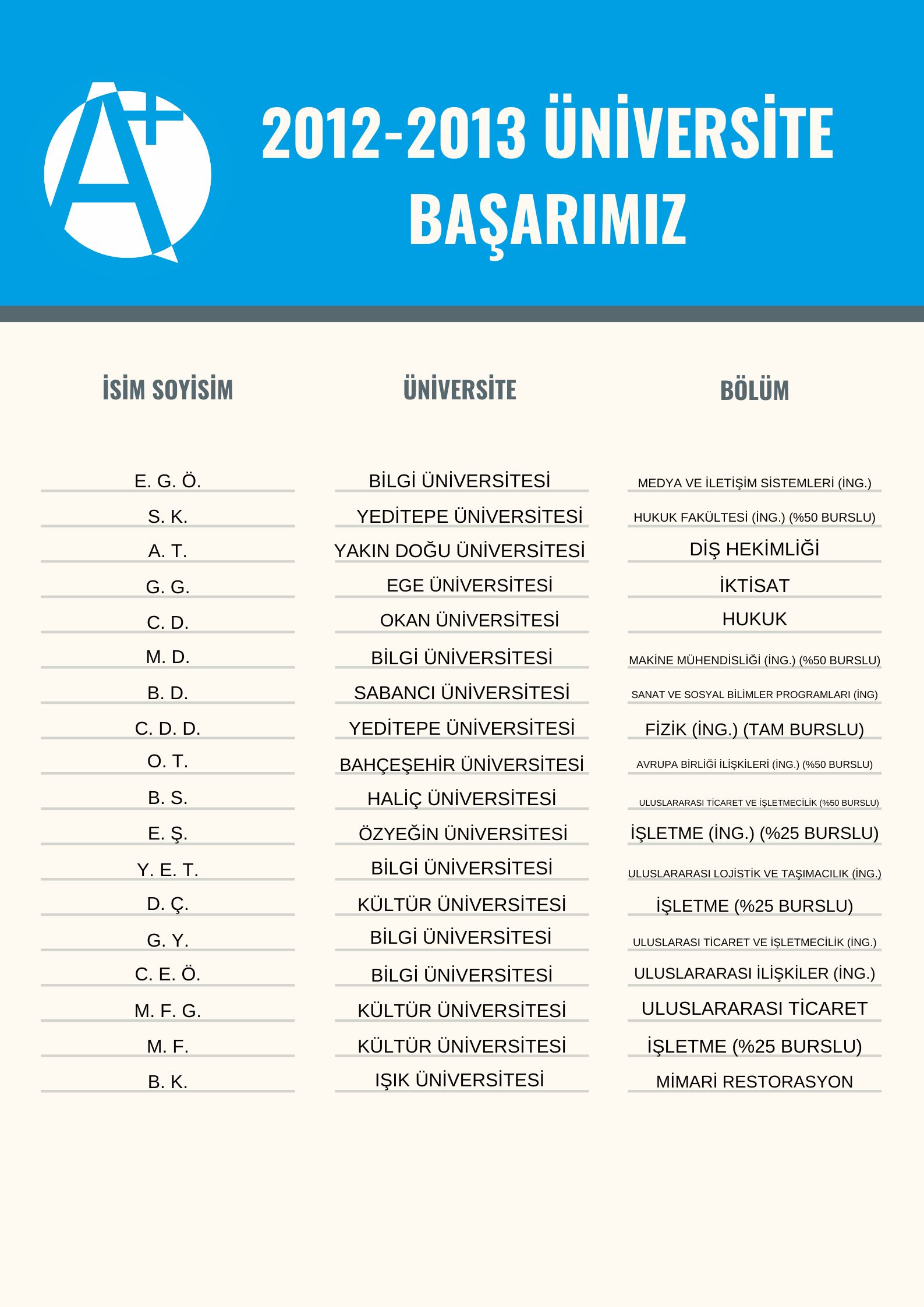 2012 – 2013 yılı üniversite başarımızı sizlerle paylaşmaktan gurur duyuyor, tüm mezunlarımıza hayatlarında başarılar diliyoruz.