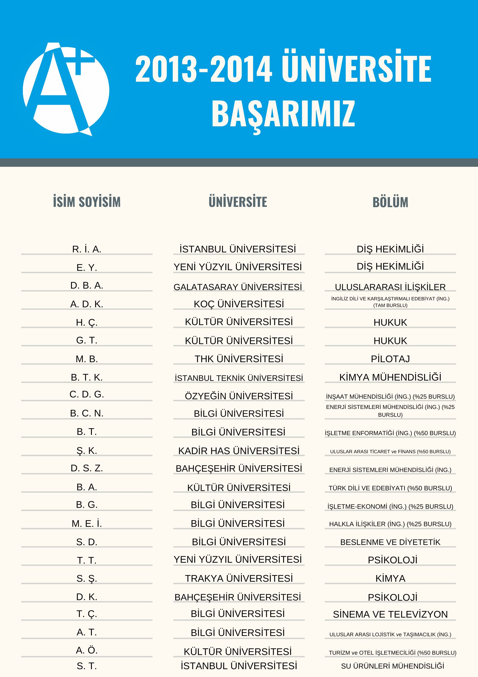 2013 – 2014 yılı üniversite başarımızı sizlerle paylaşmaktan gurur duyuyor, tüm mezunlarımıza hayatlarında başarılar diliyoruz.