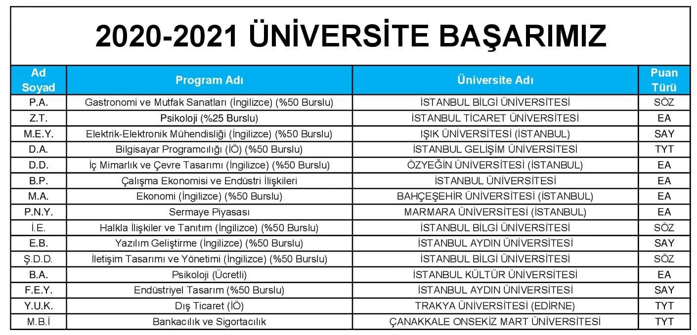 2020 – 2021 yılı üniversite başarımızı sizlerle paylaşmaktan gurur duyuyor, tüm mezunlarımıza hayatlarında başarılar diliyoruz.