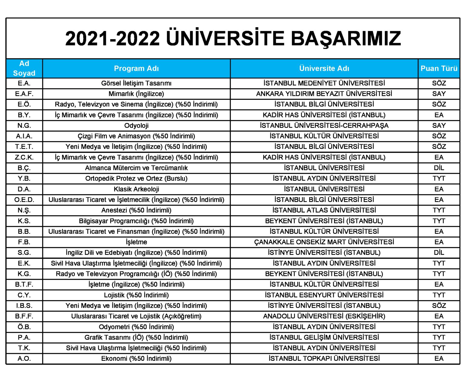 2021-2022 yılı üniversite başarımızı sizlerle paylaşmaktan gurur duyuyor, tüm mezunlarımıza hayatlarında başarılar diliyoruz.
